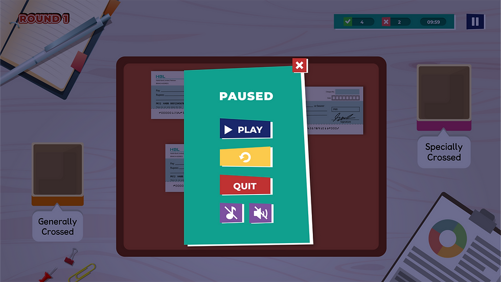 Round 1: Correctly sorting different types of cheques into their respective boxes, in a simple drag-and-drop game.